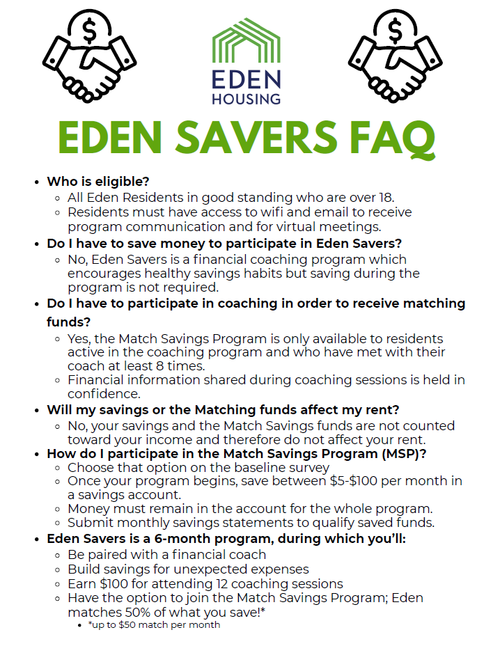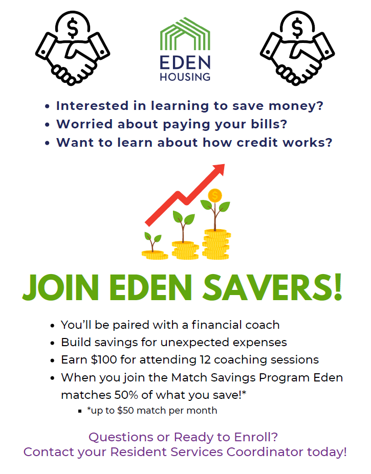 Improve your financial future with the Eden Savers Program. This Eden Housing initiative pairs residents with a volunteer advisor to set goals, create a budget, and work towards saving money, reducing debt, or improving credit—all while building your financial confidence. Enroll today!
